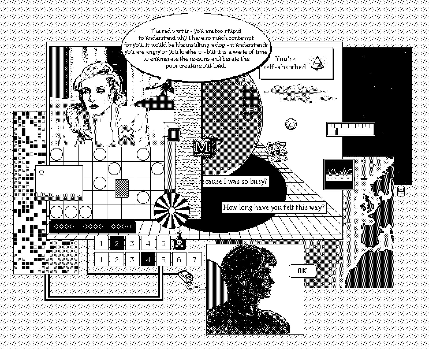 “Was I so self-absorbed I didn't realize you hated me? What kind of deep-seated hate is this that you can't even bring yourself to elaborate? Collage work from ancient Macintosh games and graphics. A pre-cursor companion series to "I Am Not Good At Computer" with {protocell:labs}”